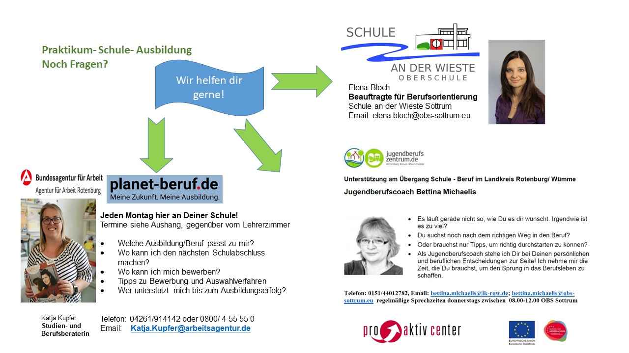Email: bettina.michaelis@lk-row.de oder bettina.michaelis@obs-sottrum.eu - Elena Bloch (Beauftragte für Berufsorientierung)