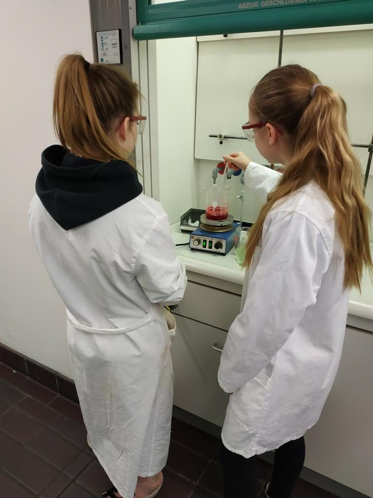 Die Schüler lernten dabei den präzisen Umgang mit Gefahrstoffen, die verschiedenen Eigenschaften der unterschiedlichen Fasern (Naturstoffe und Kunststoffe) und die damit verbundene chemische Herangehensweise für das Erreichen einer Färbung.