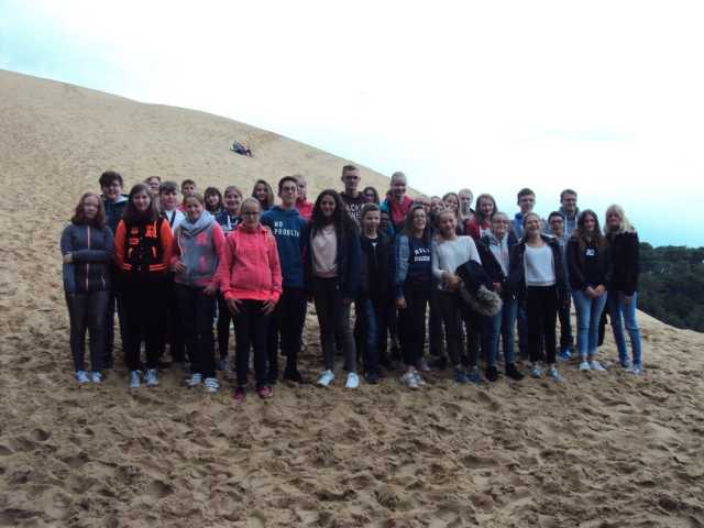 Am Morgen frühstückten wir mit der Gastfamilie und wurden später zur Schule gefahren. Von dort ging es mit dem Bus weiter zur Dune du Pilat. Das ist die größte Wanderdüne Europas, sie ist 110 m hoch, ca. 500 m breit und ca. 2,7 km lang. Nachdem wir die Wanderdüne bestiegen hatten, wurden mehrere Fotos gemacht. Einigen von uns sind tatsächlich auch auf der anderen Seite nochmal runter- und wieder hochgelaufen. Am Parkplatz wurde noch ein schönes Picknick veranstaltet, dass wir von der Gastfamilie mitbekommen haben. Nächster Programmpunkt war die Fahrt zu einer Austernzucht. Dort wurden deutsch-französische Gruppen gebildet. Uns wurde aufs Genauste gezeigt, wie die Austernzucht funktioniert. Zum Schluss durften wir kostenlos Austern probieren. Normalerweise schmecken Austern sehr salzig, aber dadurch, dass wir Zitrone bekamen, wurde der Geschmack deutlich besser. Austern essen ist und bleibt Geschmacksache. Nach diesem letzten Programmpunkt ging es zurück zur Schule und von dort wieder in die Gastfamilien.