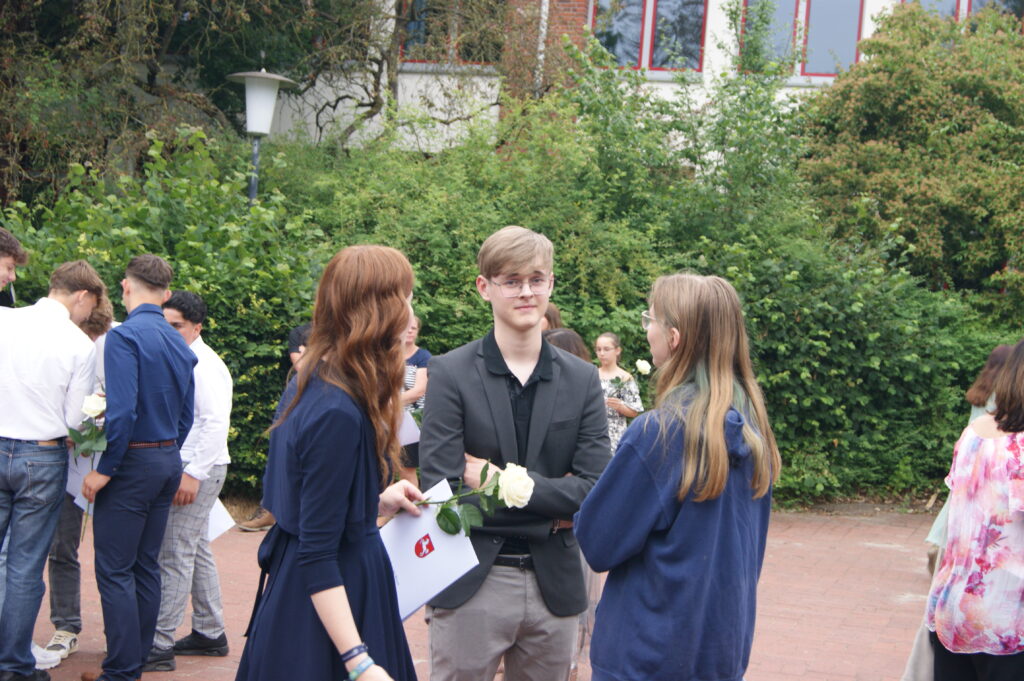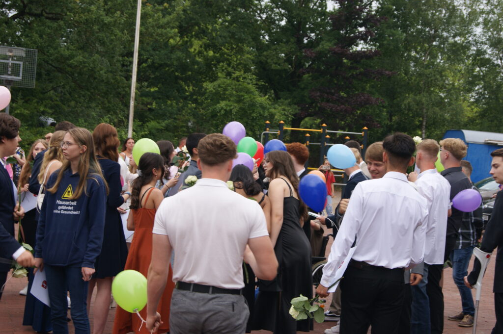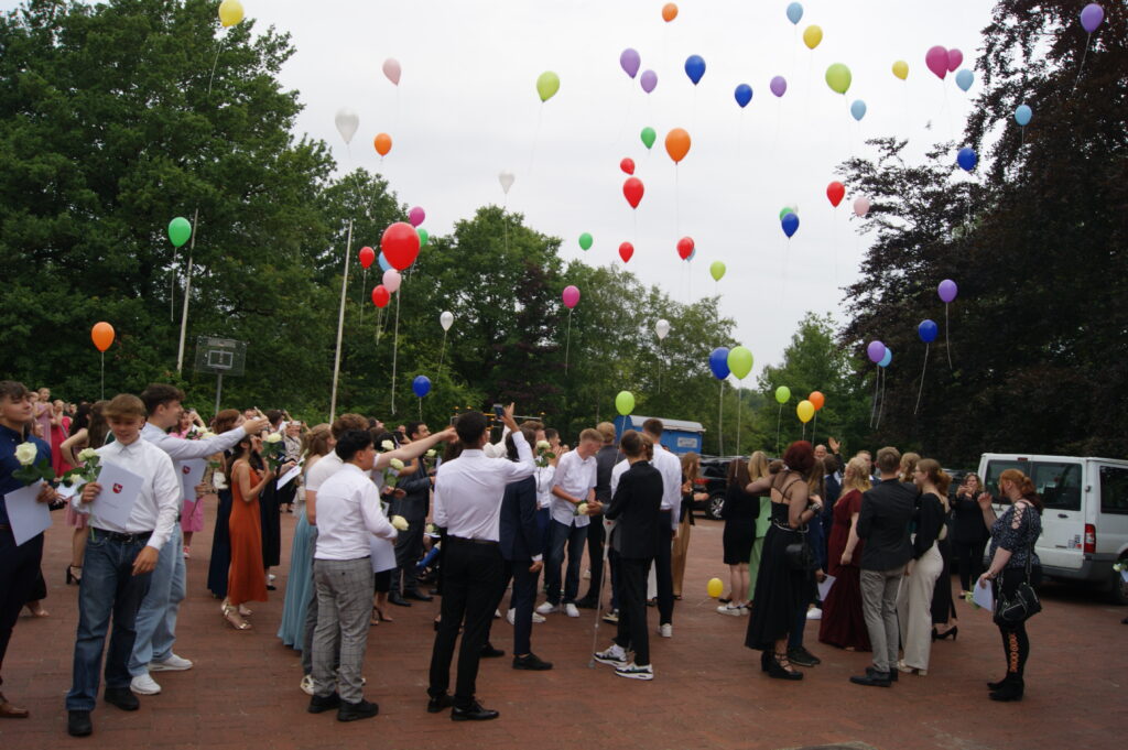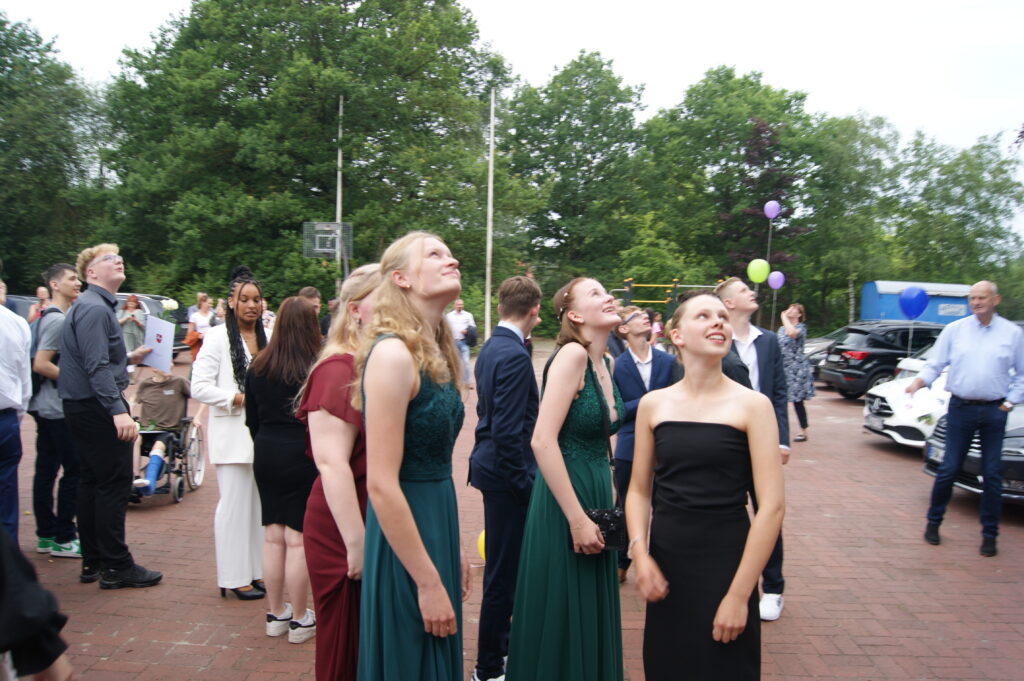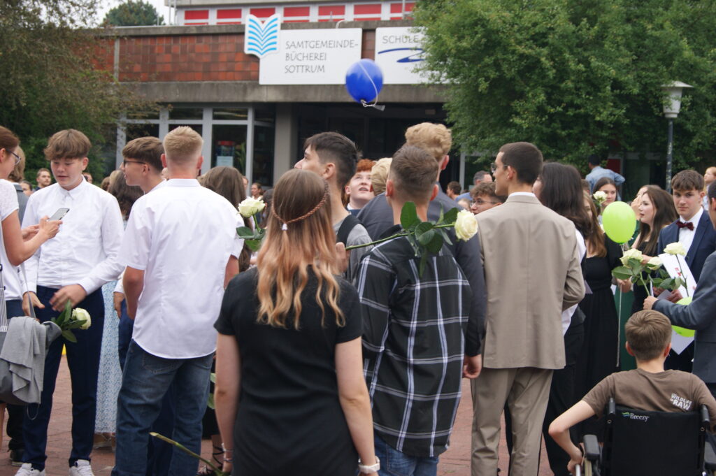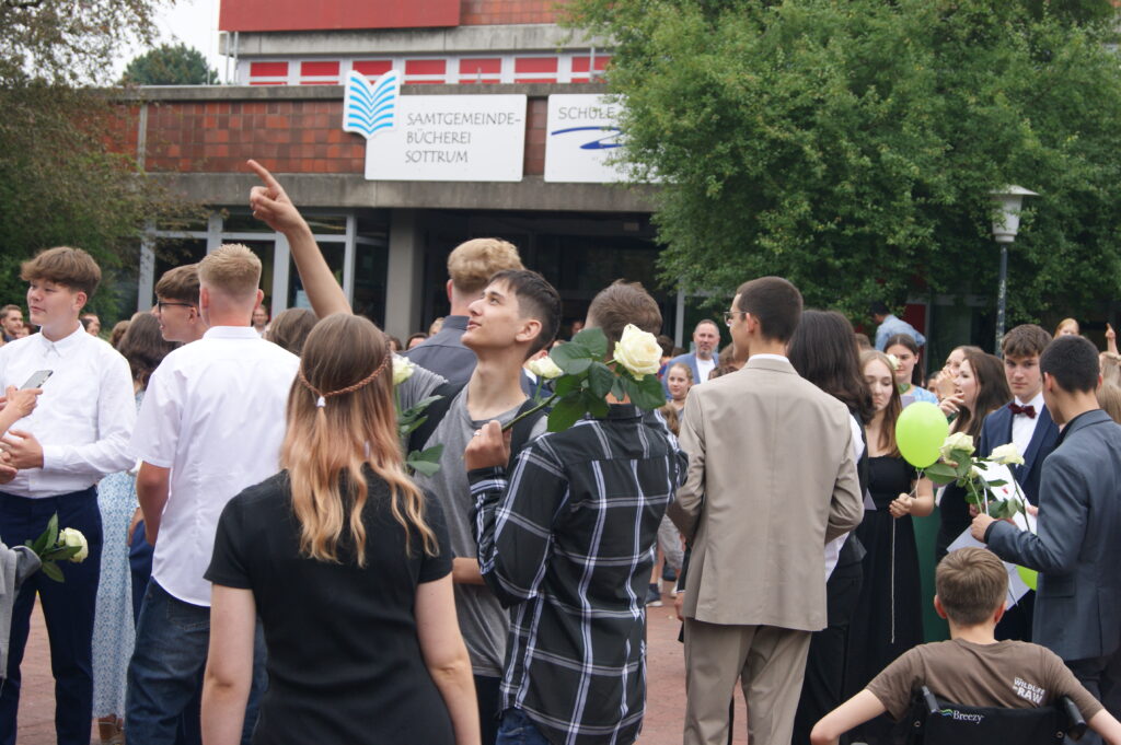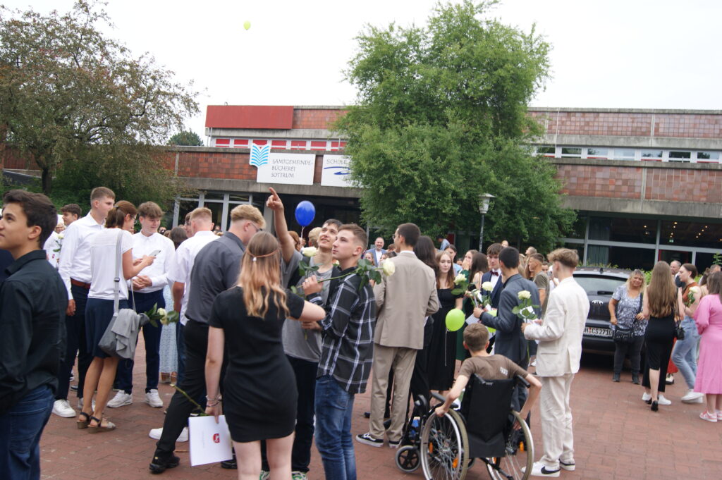 Nach der Zeugnisvergabe und der Verleihung der Ehrennadeln (http://obs-sottrum.de/ehrennadelverleihung-2022-23-klassen-5-10/) ging es nach draußen, man ließ die Absolventen abheben und genoss das Event in einem lockeren Beisammensein.