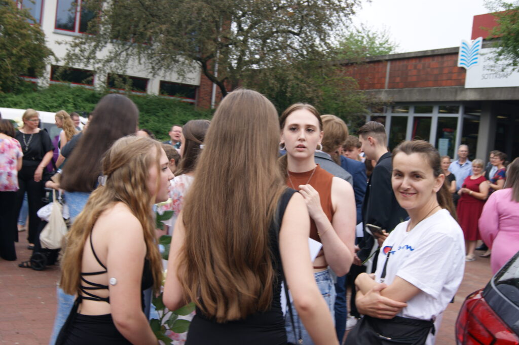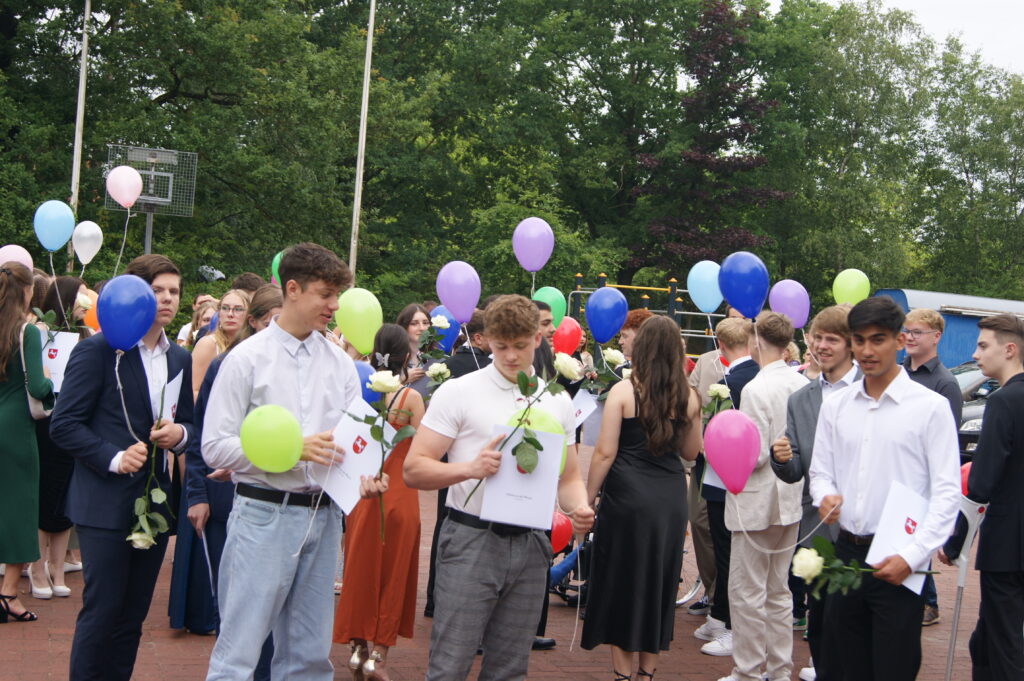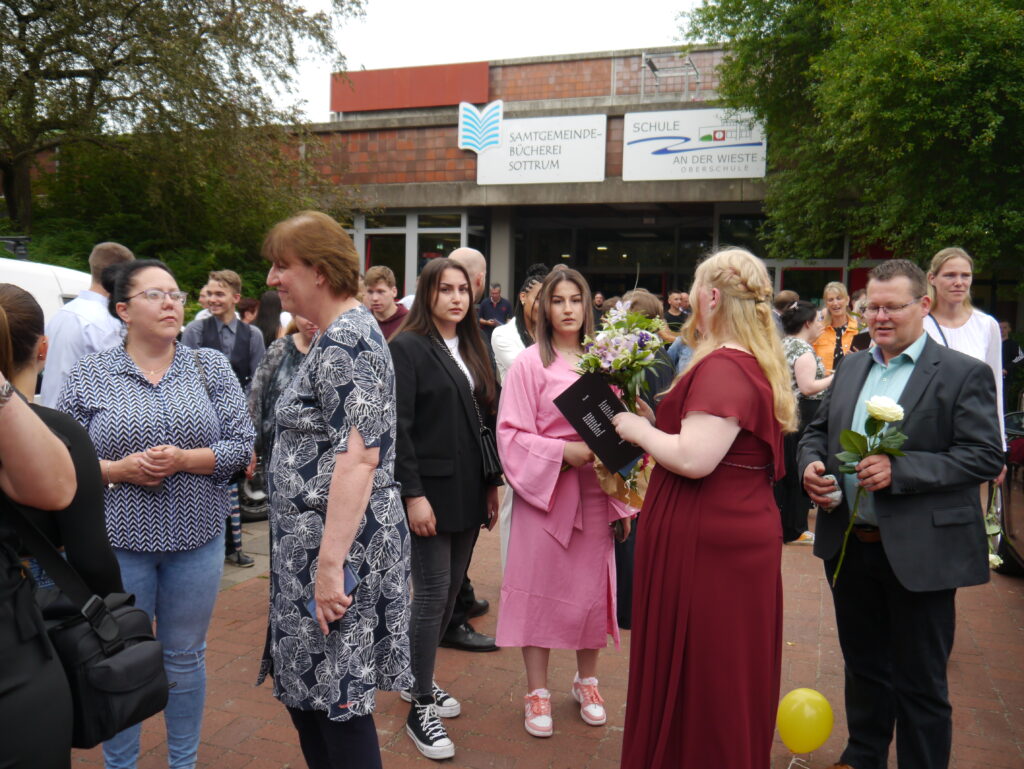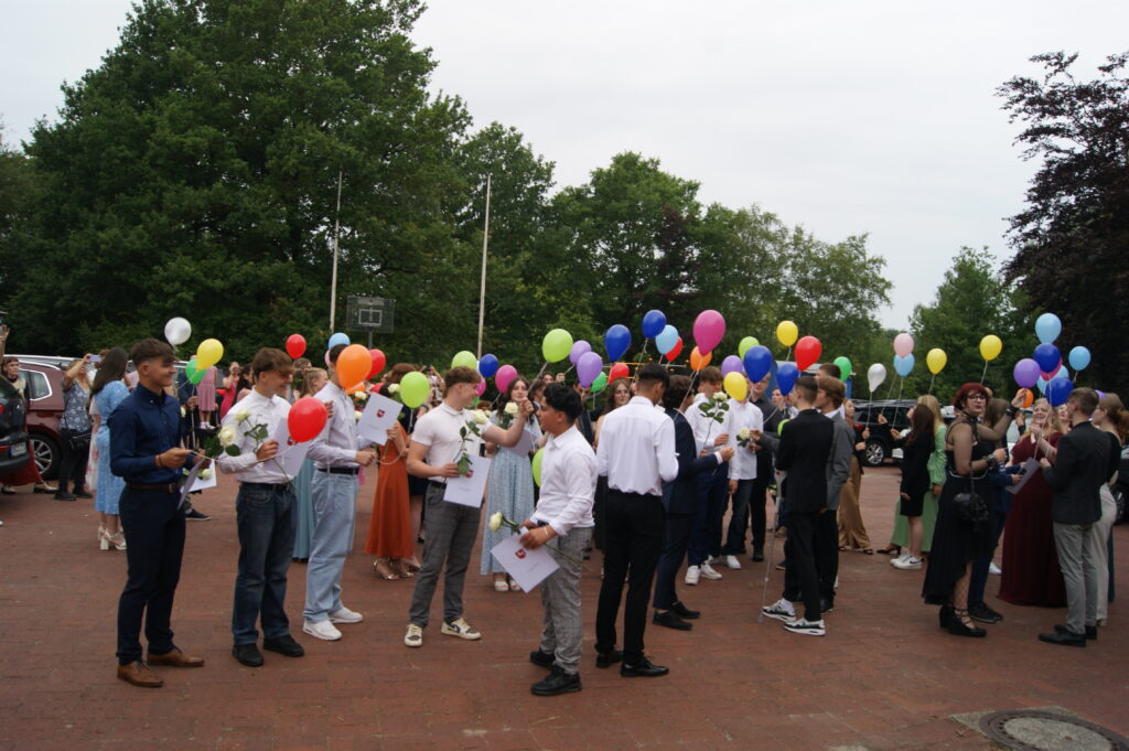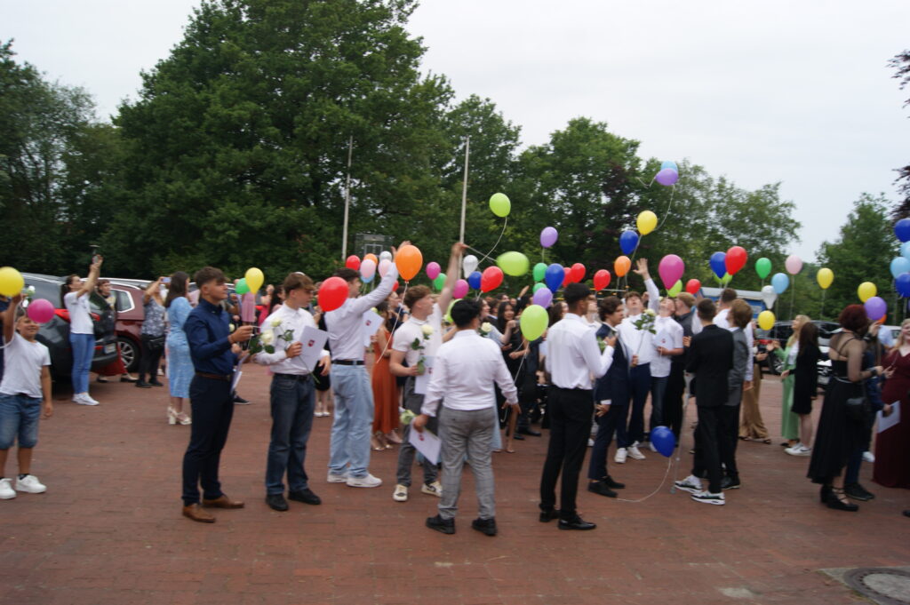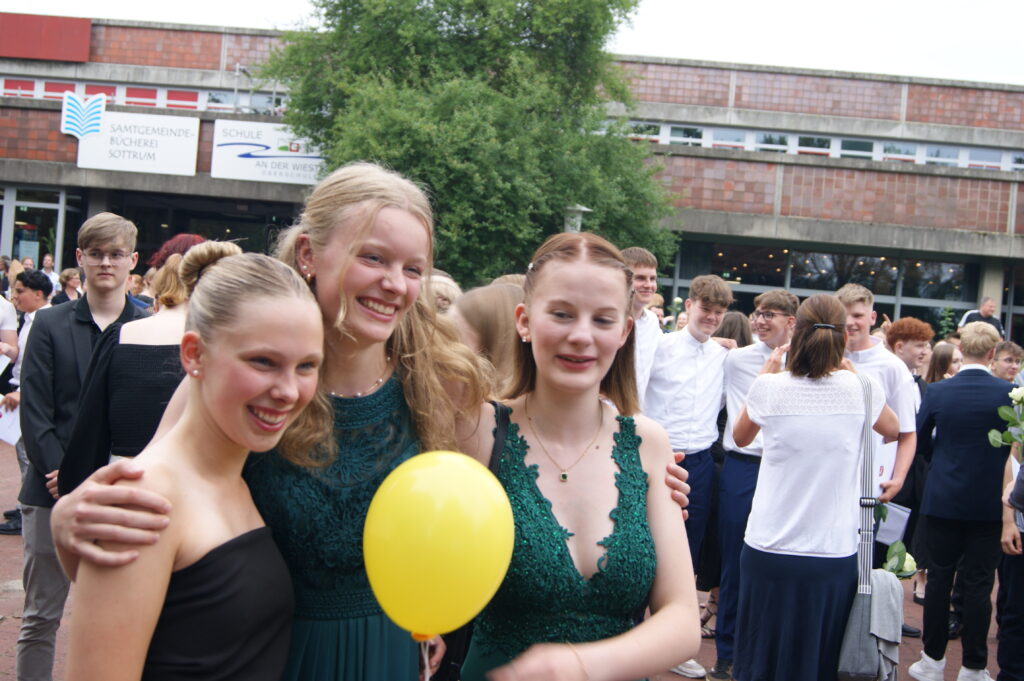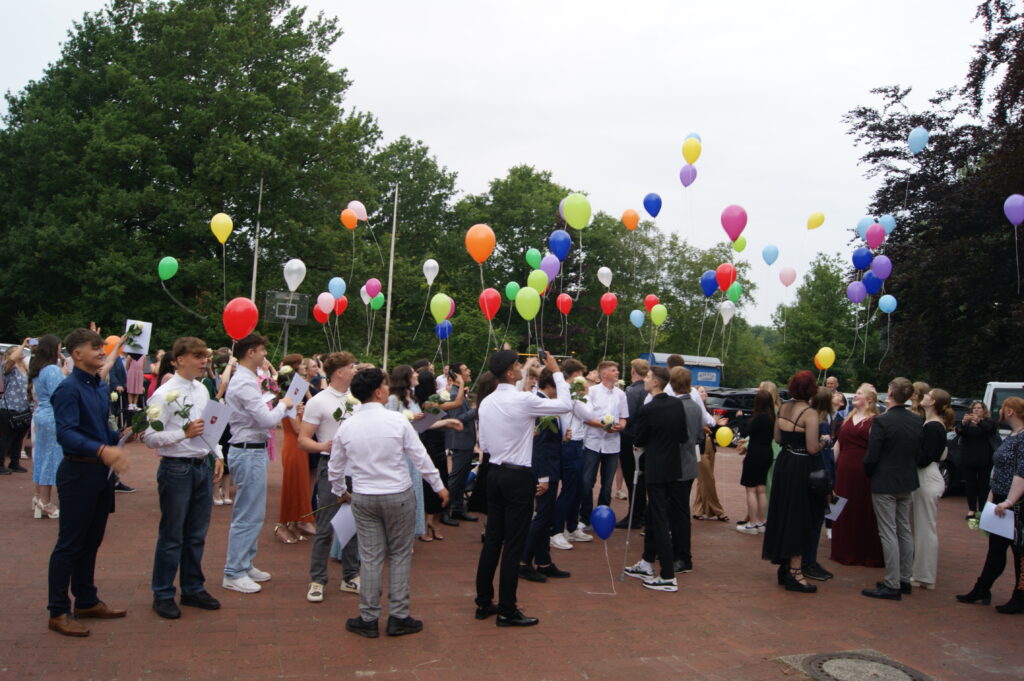 Nach der Zeugnisvergabe und der Verleihung der Ehrennadeln (http://obs-sottrum.de/ehrennadelverleihung-2022-23-klassen-5-10/) ging es nach draußen, man ließ die Absolventen abheben und genoss das Event in einem lockeren Beisammensein.