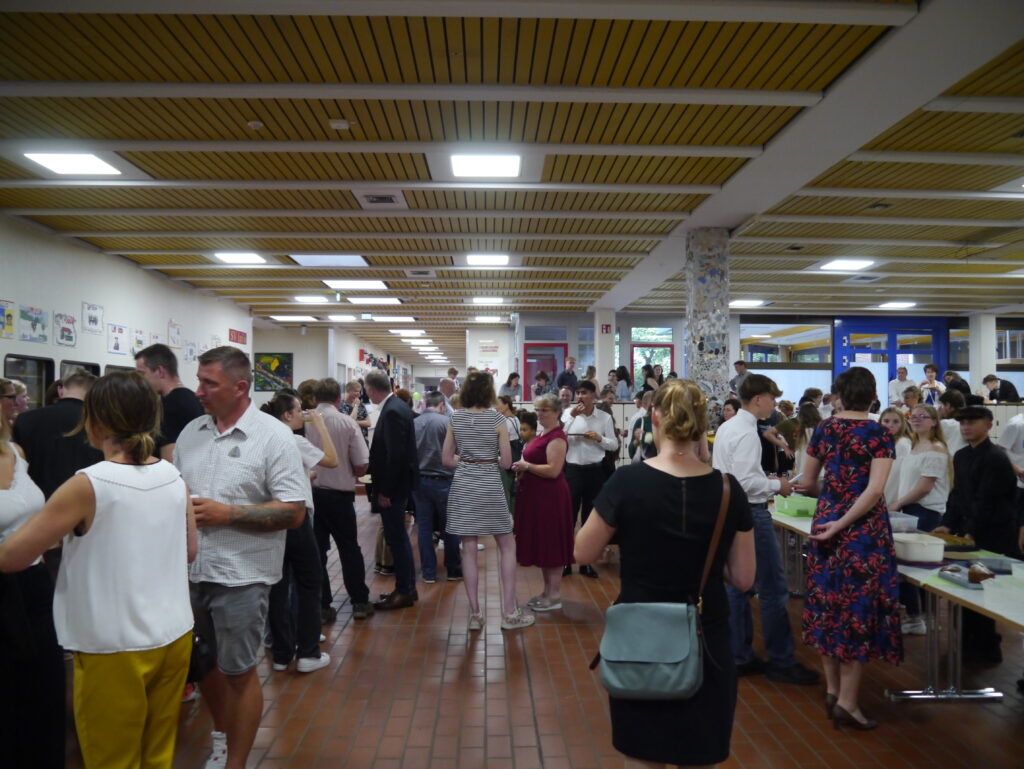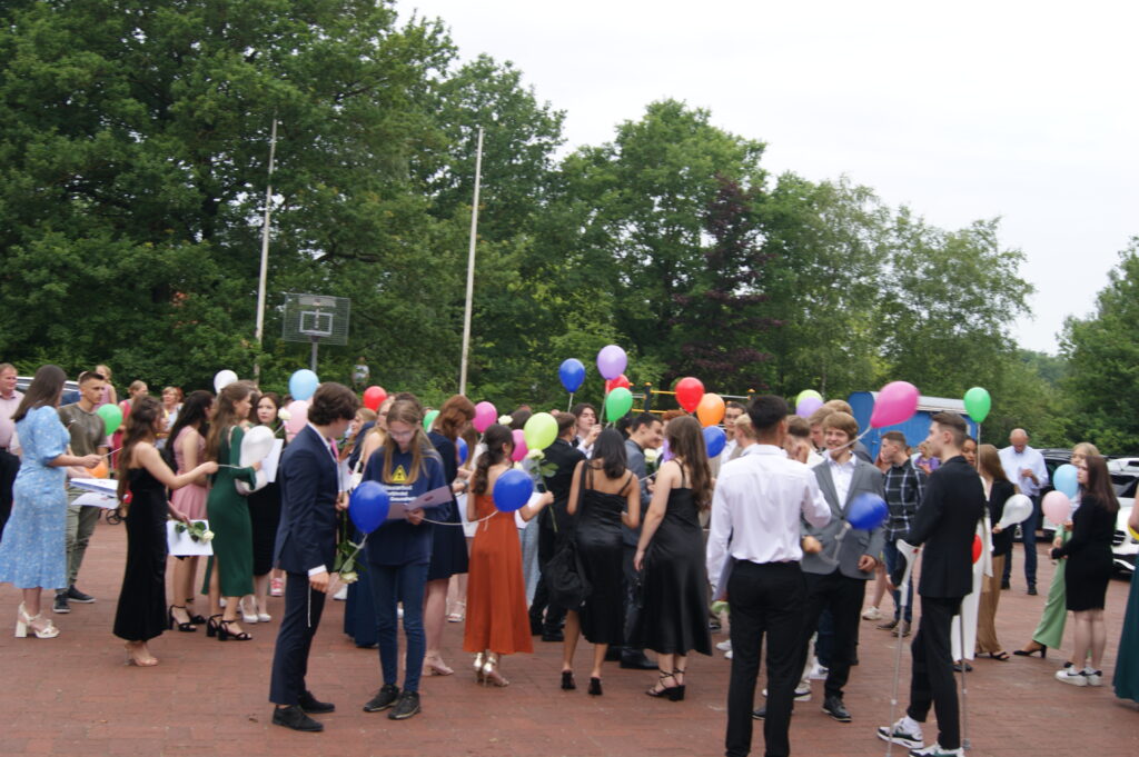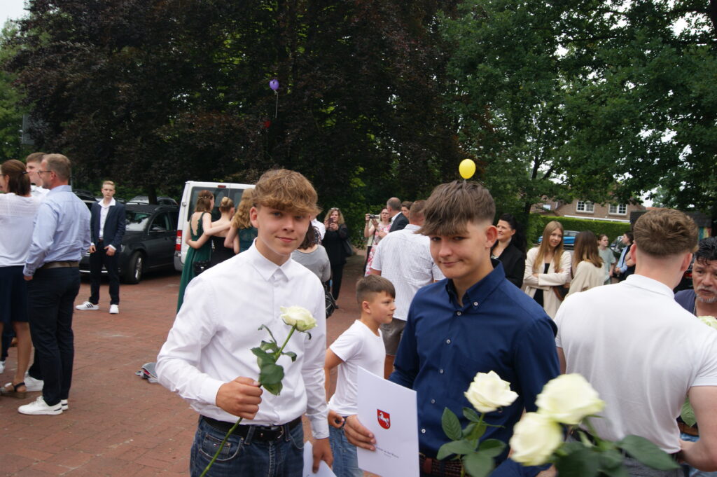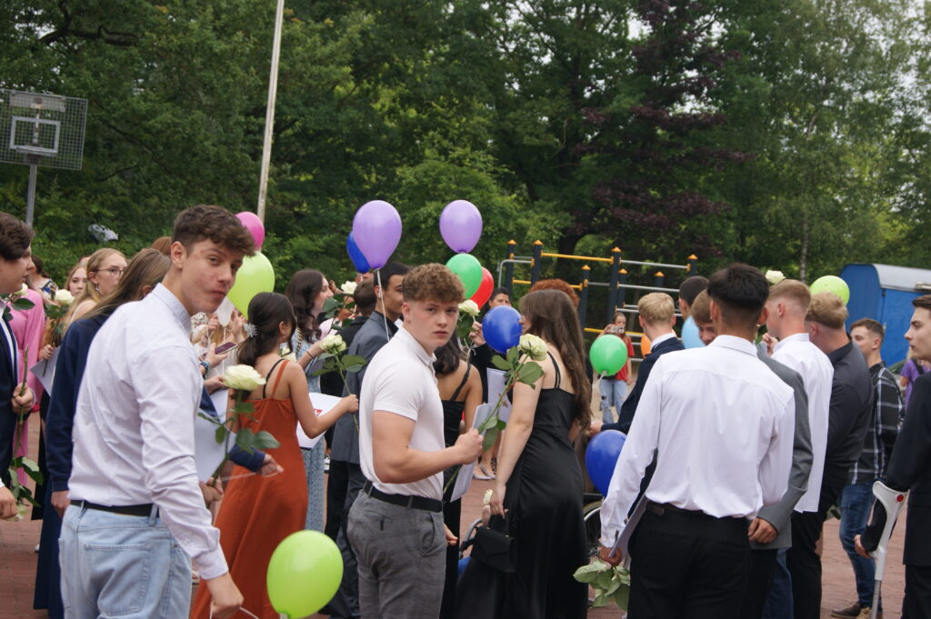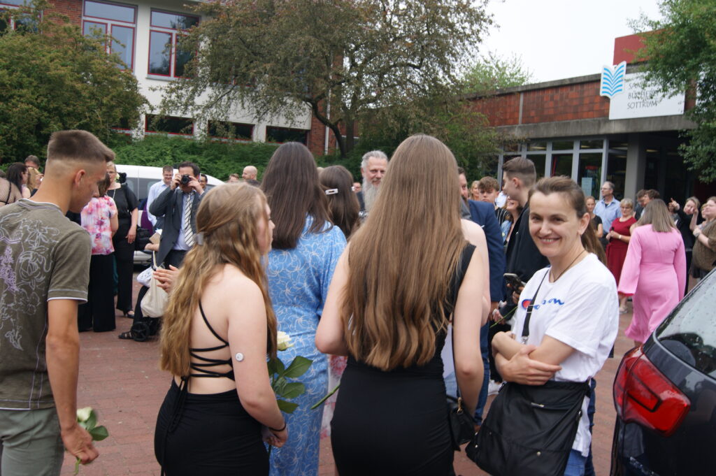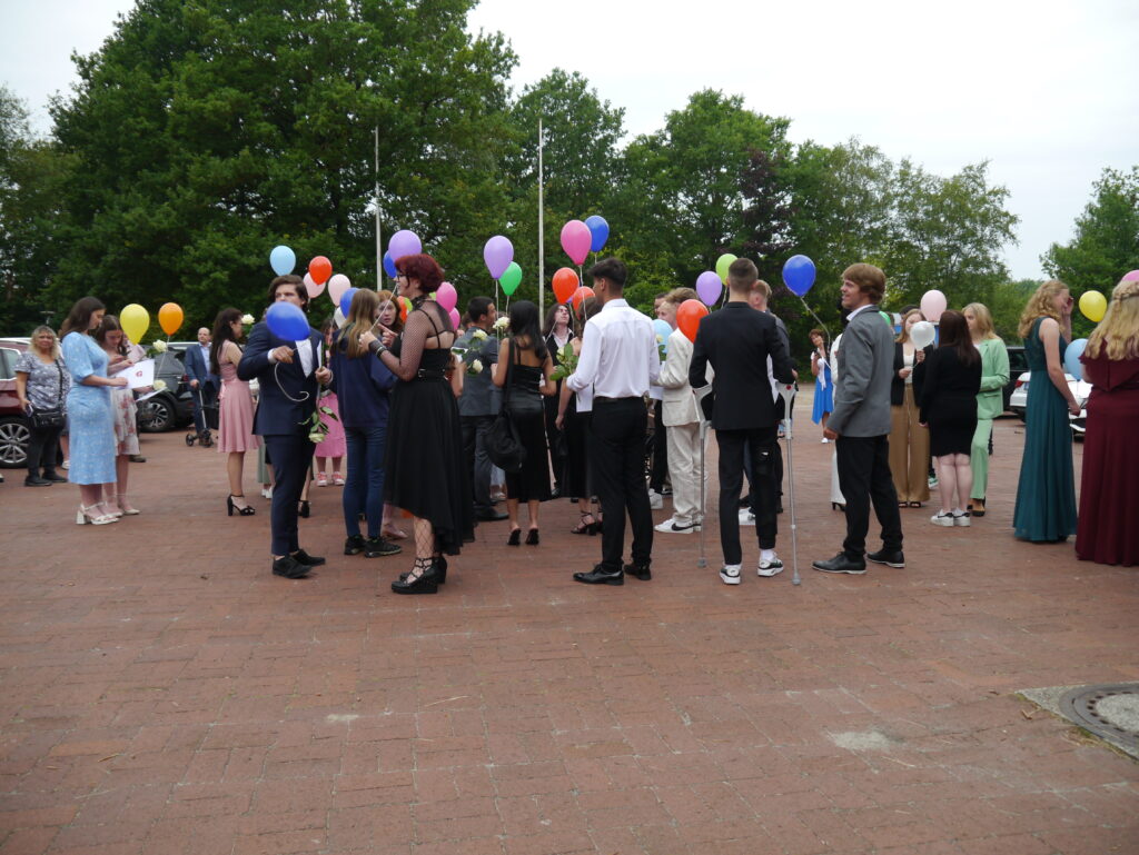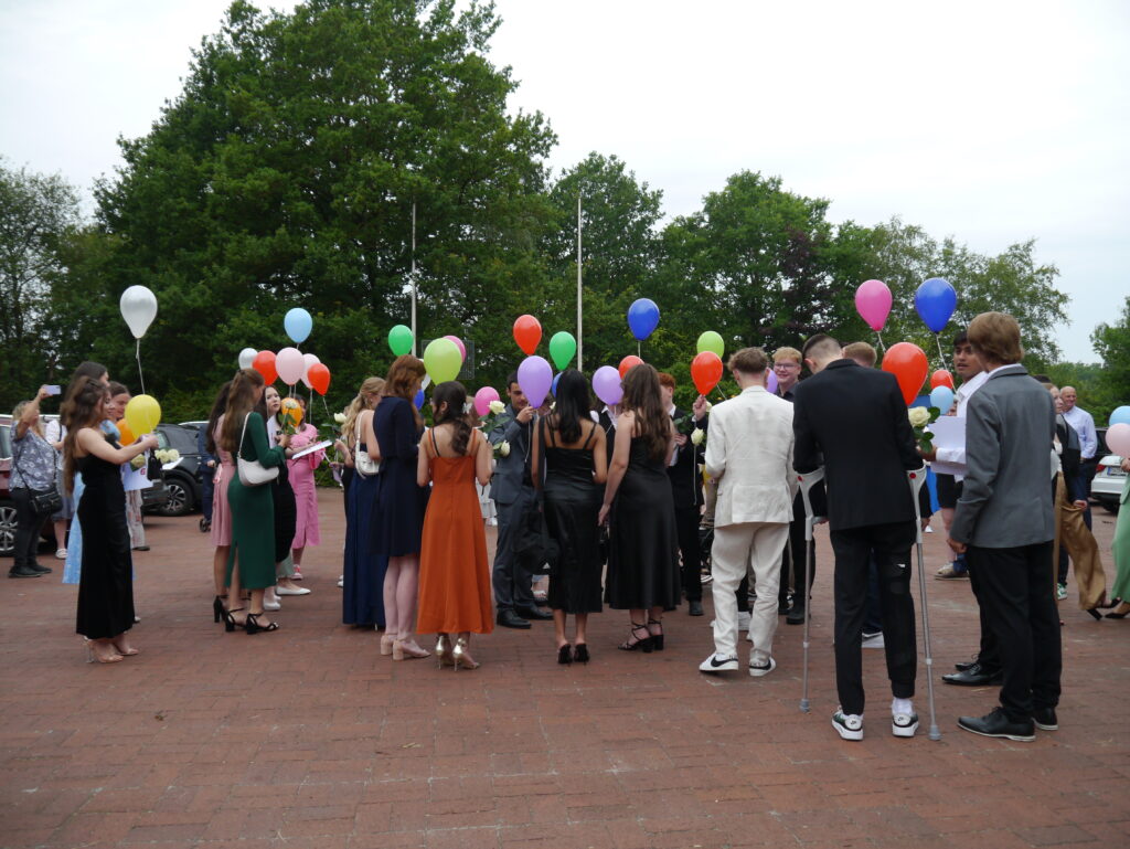 Nach der Zeugnisvergabe und der Verleihung der Ehrennadeln (http://obs-sottrum.de/ehrennadelverleihung-2022-23-klassen-5-10/) ging es nach draußen, man ließ die Absolventen abheben und genoss das Event in einem lockeren Beisammensein.