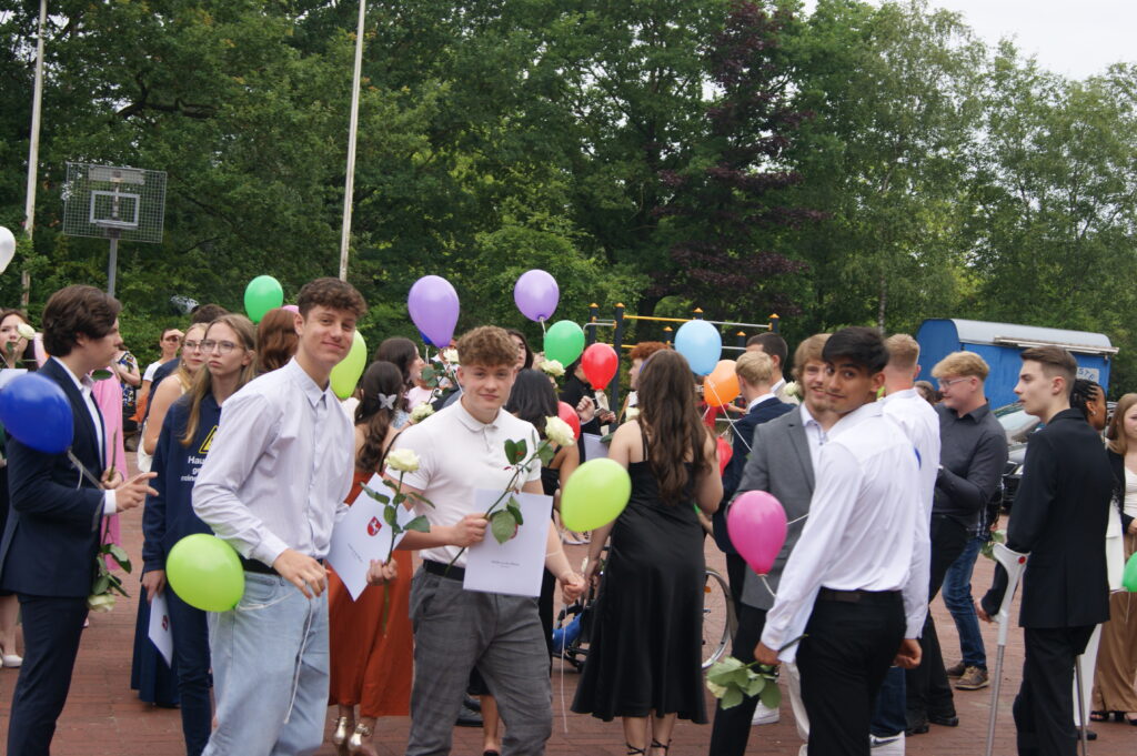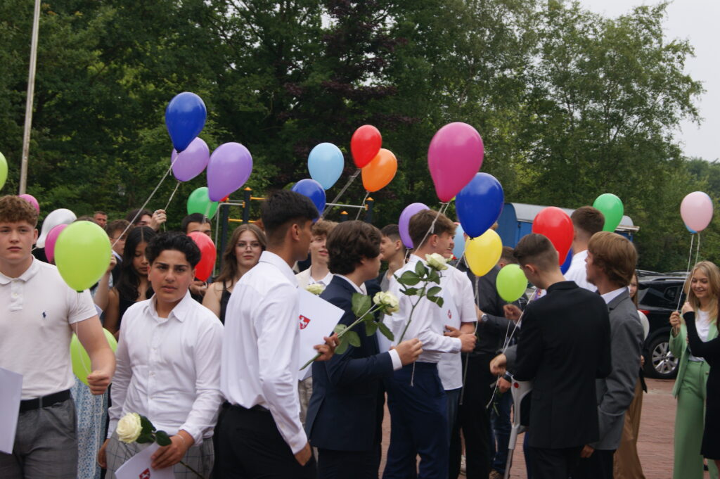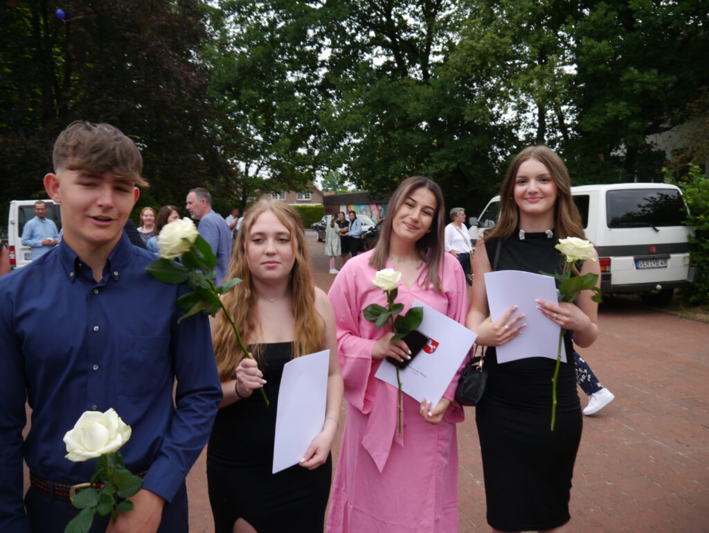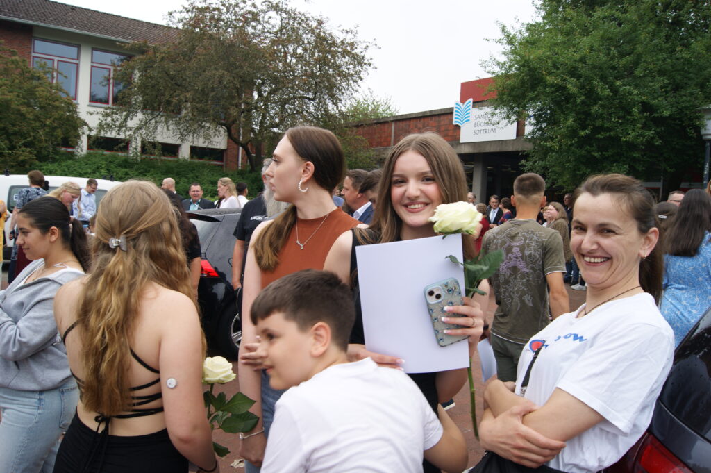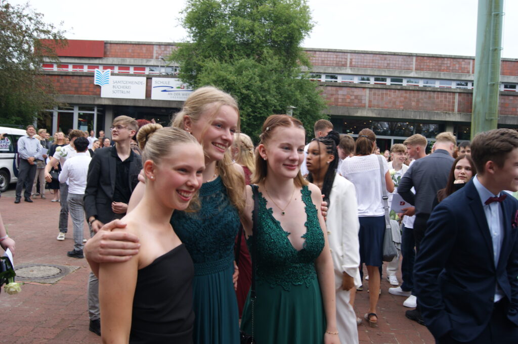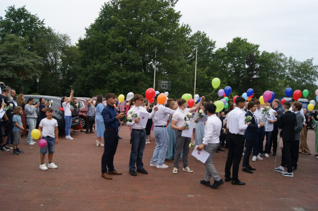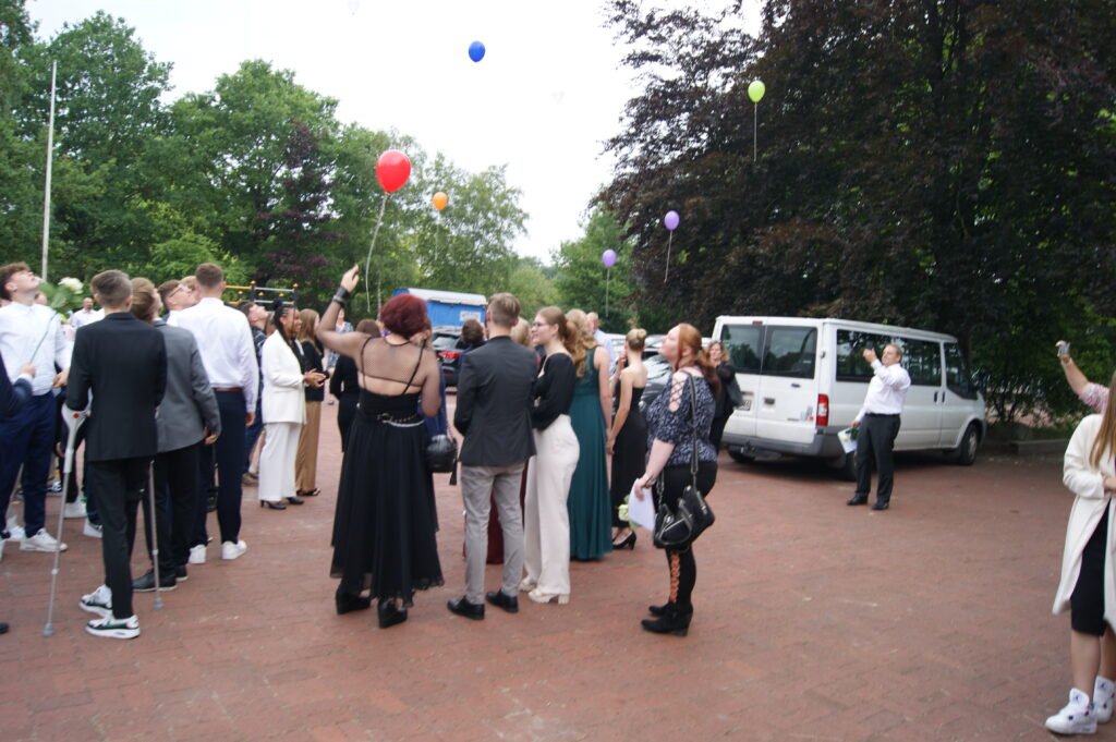 Nach der Zeugnisvergabe und der Verleihung der Ehrennadeln (http://obs-sottrum.de/ehrennadelverleihung-2022-23-klassen-5-10/) ging es nach draußen, man ließ die Absolventen abheben und genoss das Event in einem lockeren Beisammensein.