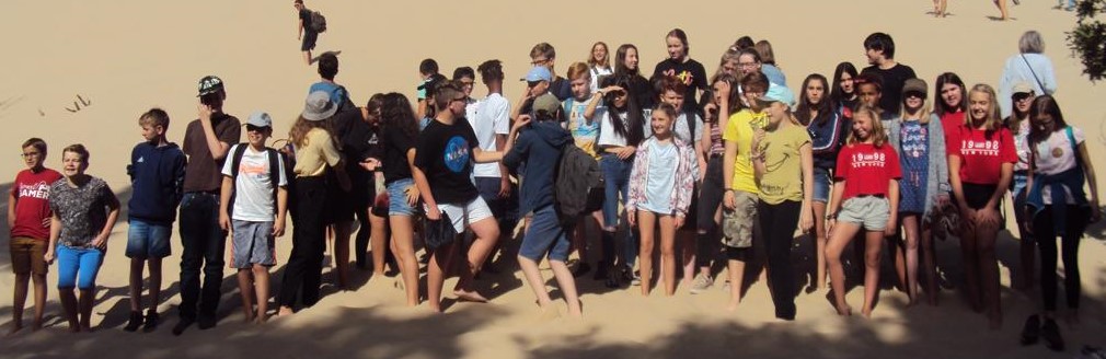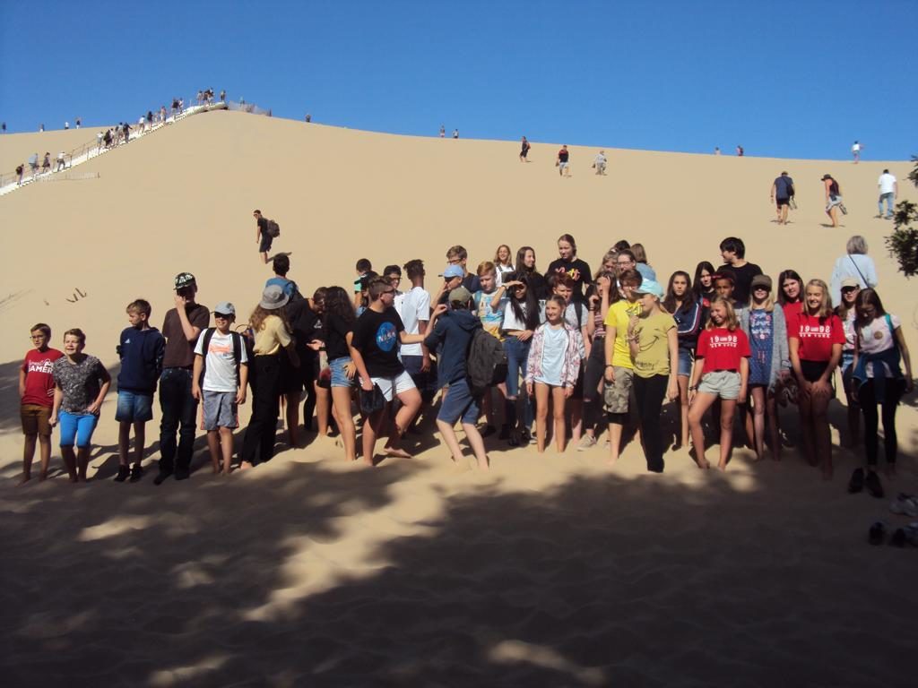 Am Mittwoch, dem 18. September, haben wir uns um 8.30 Uhr getroffen um zur „Dune du Pilat“ zu fahren. Das ist die höchste Wanderdüne von Europa. Es war schon morgens sehr warm! Vor der Düne haben wir erstmal ein Gruppenfoto gemacht.
